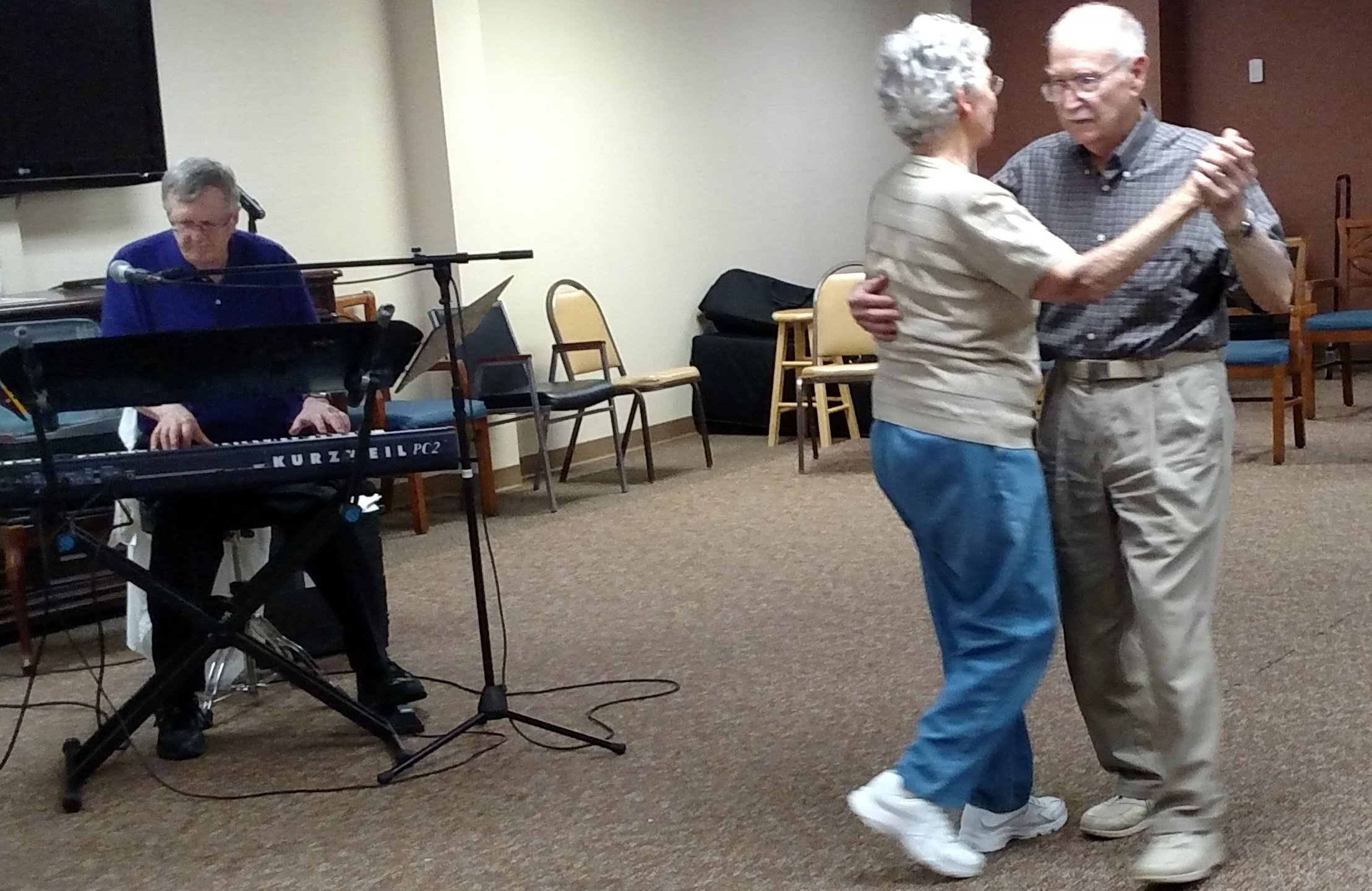 Walt Griesinger on Keyboard, Doris Huff dancing with Don Huff, former drummer at Wedding Anniversary, 2018